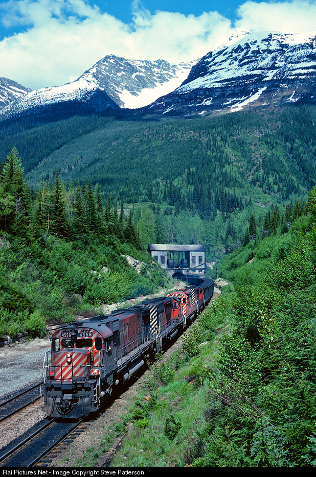 | CP Alco 4559 and its three EMD mates with a westbound unit coal train have surmounted 4640-ft. Rogers Pass inside 5-mile long Connaught Tunnel. As it begins its descent on a 2.4% grade on the old line, the British Columbia Selkirks dominate the background. |