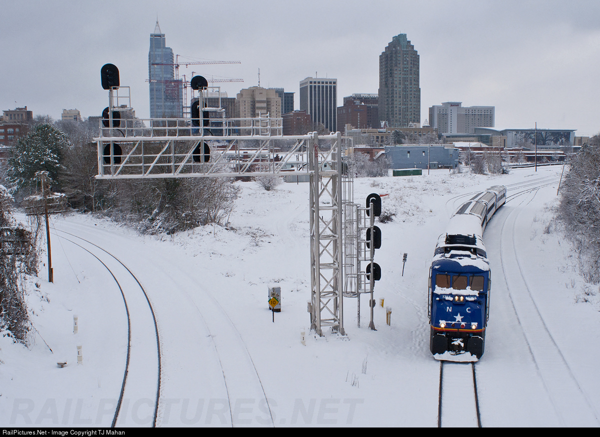 | While visiting family in Raleigh, I got a great Christmas gift... SNOW! Here we see Amtrak 74 departing Raligh for points west, the train was full of Holiday travelers! |