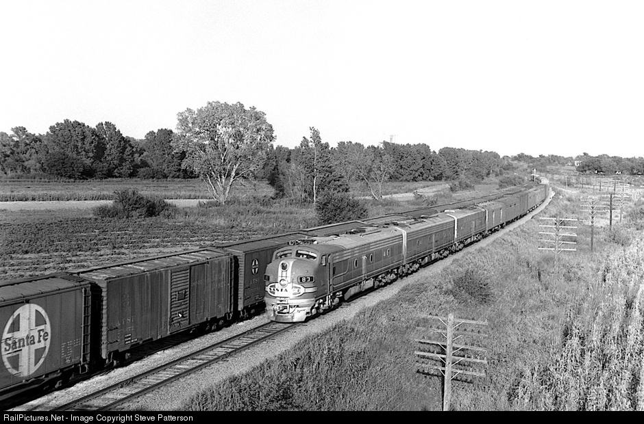 Now designated as an E8, cab unit 80L was rebuilt in 1953 from an E-1, and leads westbound Train 11, The Kansas Cityan, at Tecumseh, Kansas, headed for Topeka and on to Texas on Aug. 27, 1967. Surplus 40-ft. box cars were gathering in little-used sidings, awaiting disposition.