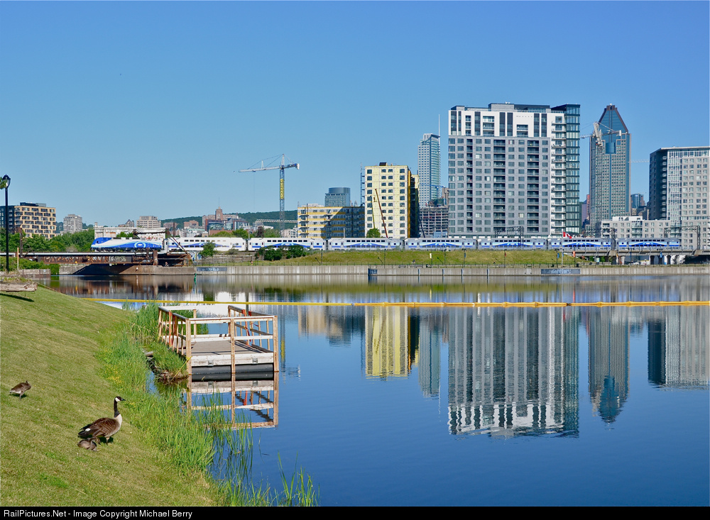 AMT 807 is nearly at Central Station in Montreal during the morning rush hour. It is being pushed by AMT 1363 and is passing the scenic Peel Basin. Some Canadian geese were here for quite awhile!