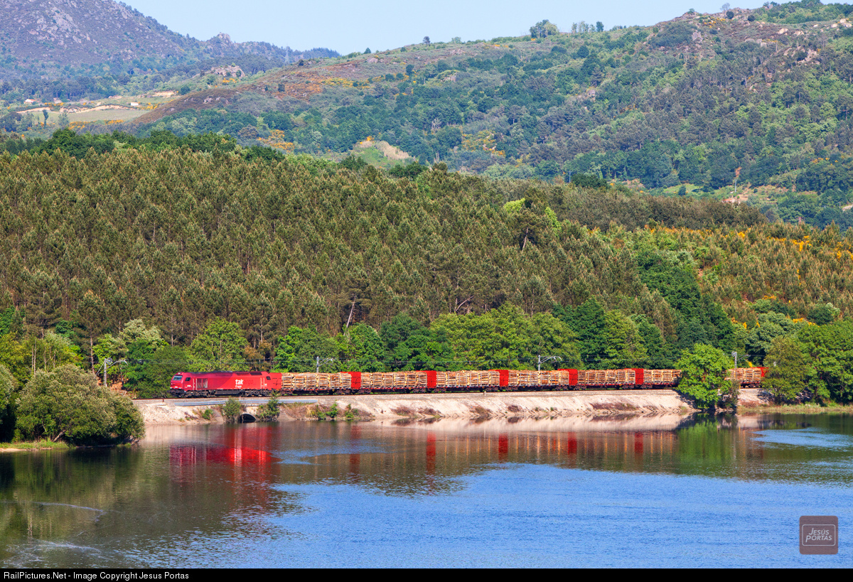 Takargo Rail loaded with wood and bound for Portugal running here along MiƱo river.