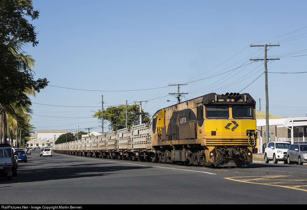 2831 eases an empty livestock train down the middle of Denison Street, Rockhampton. Believe it or not this is Queensland's North Coast Main Line, which runs along Denison St for about 1.8km - the only substantial section of mainline street running in Australia. Queensland is also the only state in Australia to still transport livestock by rail.