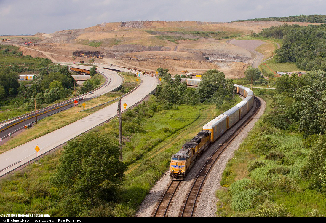 A run-through UP powered auto rack train rolls along the CSX Keystone Sub, passing by the Mason/Dixon Highway and a large strip mining operation as it comes into Meyersdale, PA. preparing to pass under the former Western Maryland Salisbury Viaduct, which is now a rail-trail.