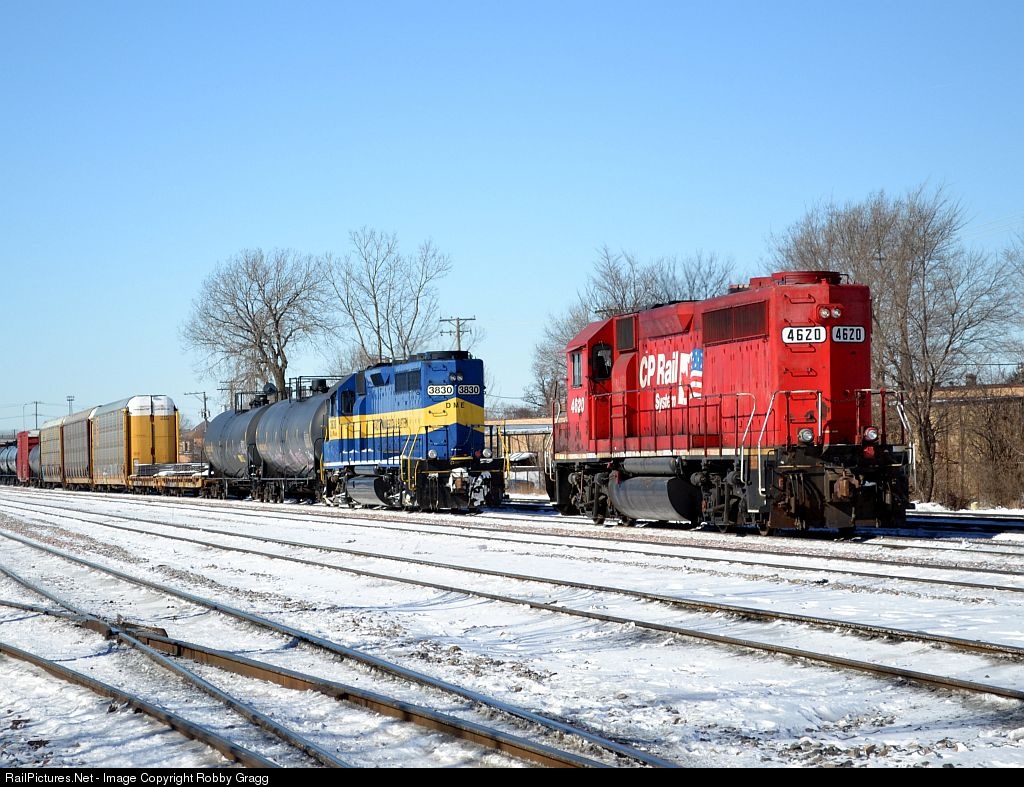 | CP GP40 4620 backs onto DM&E 3830 in Franklin Park. 3830 didn't have a crew, so rather than send another crew out they sent another unit to retrieve it and its train and shove them back into the yard. |
