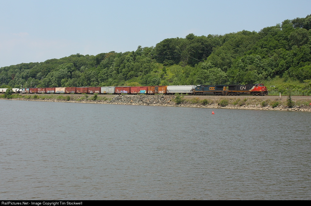 CN C44-9W leads an eastbound CSX manifest along the Mohawk River at Cranesville, NY as it heads for Selkirk.