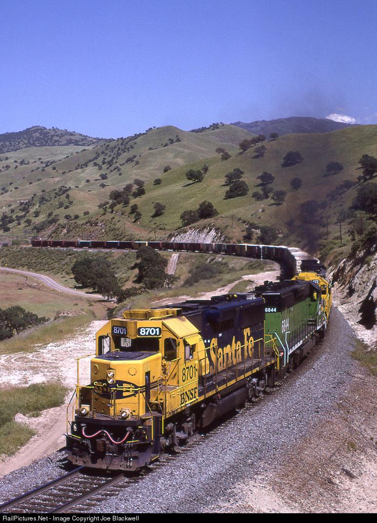 ExSanta Fe now BNSF 8701 leads an eastbound BNSF manifest climbing out of Caliente in the Tehachapi Mountains. For reasons unkown to me almost twenty years after the merger the entire class of GP60's IN SERVICE are still in Santa Fe blue and yellow.