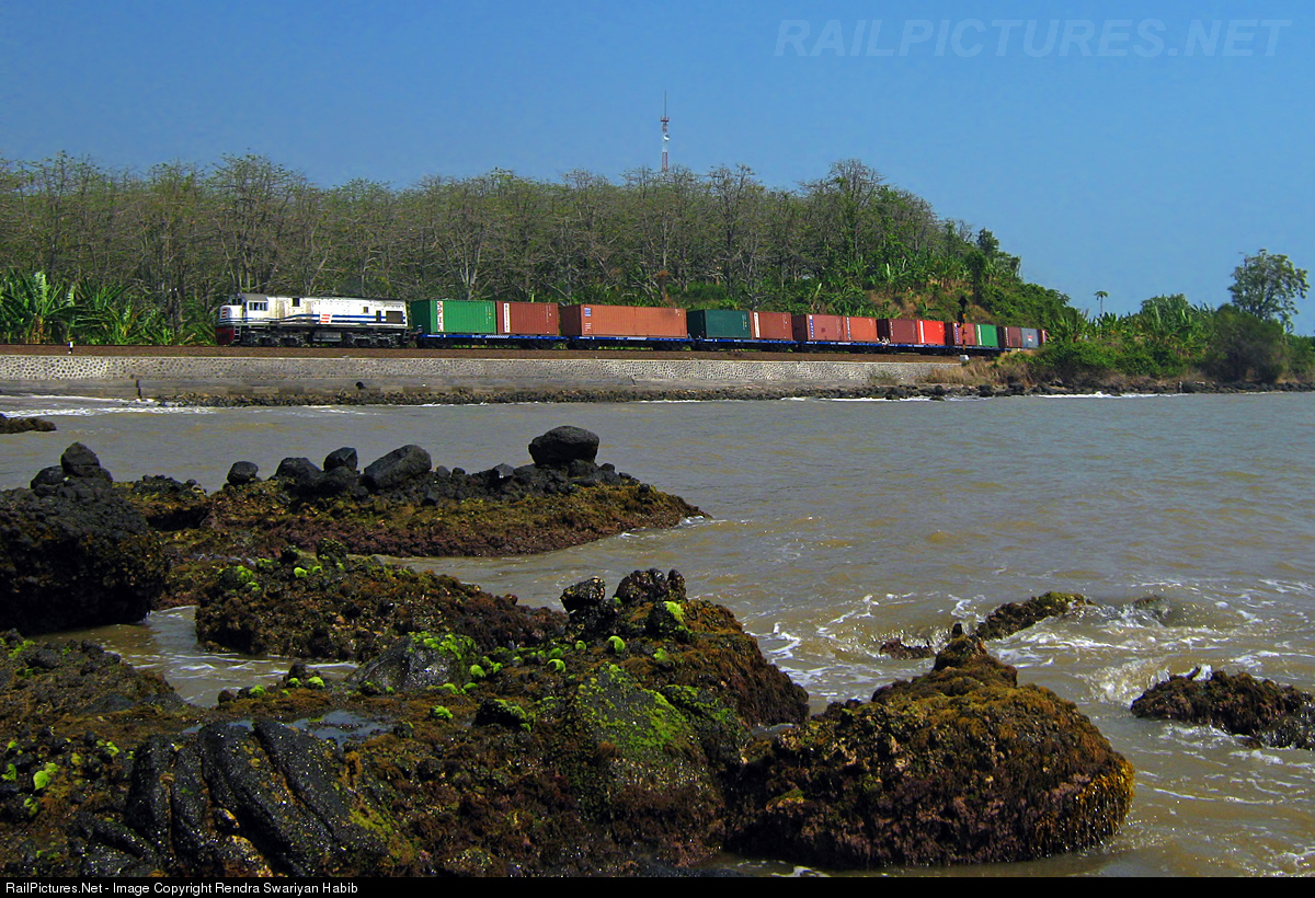 a freight train from Jakarta to Surabaya passing railroad on the beach at Plabuan
