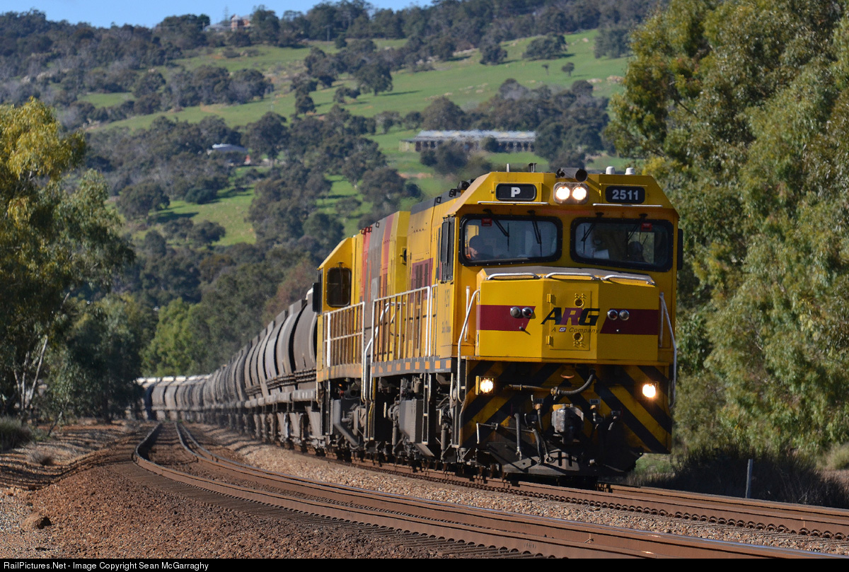 | Two Watco-hired P class P2511 & P2517 work a rake loaded XU grain hoppers (also hired from Aurizon) from Cadoux as the roll through Brigadoon. |