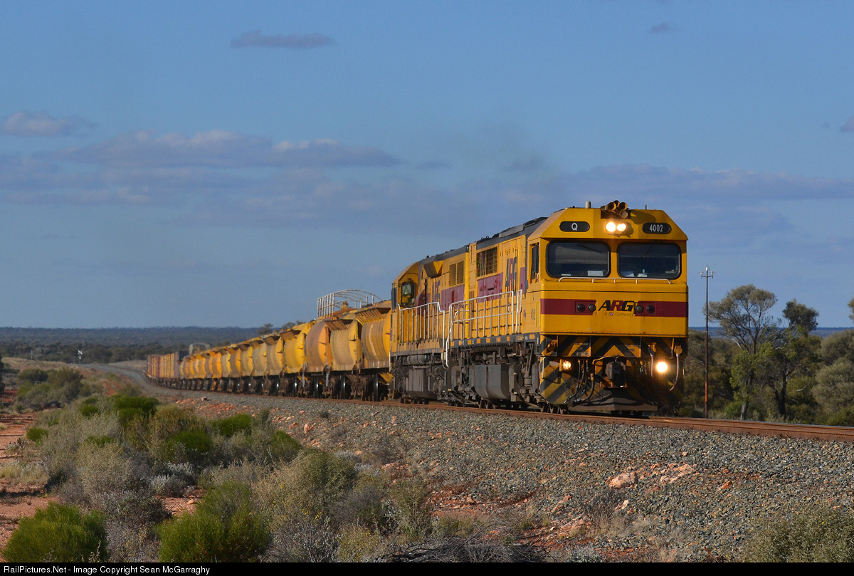 | Q4002 & LZ3112 work the 6478 combined loaded nickel hoppers and loaded lead concentrate containers from Leonora to West Kalgoorlie, photographed as the train nears the small town of Menzies. |