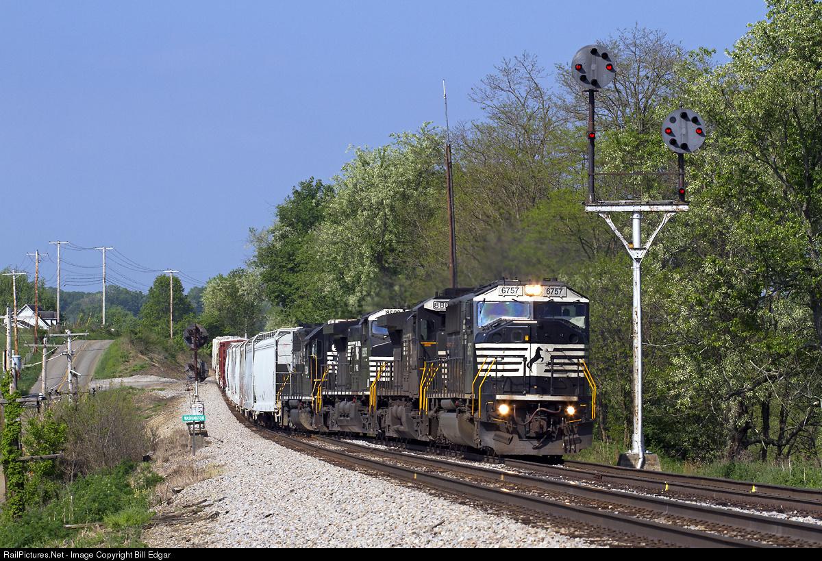 NS 6757, former Conrail SD60M, leads train 38Q into the siding at Glade Spring, VA to run around work equipment occupying the main. The train splits historic N&W color position light signals still in service on this portion of the former N&W east of Bristol, VA.