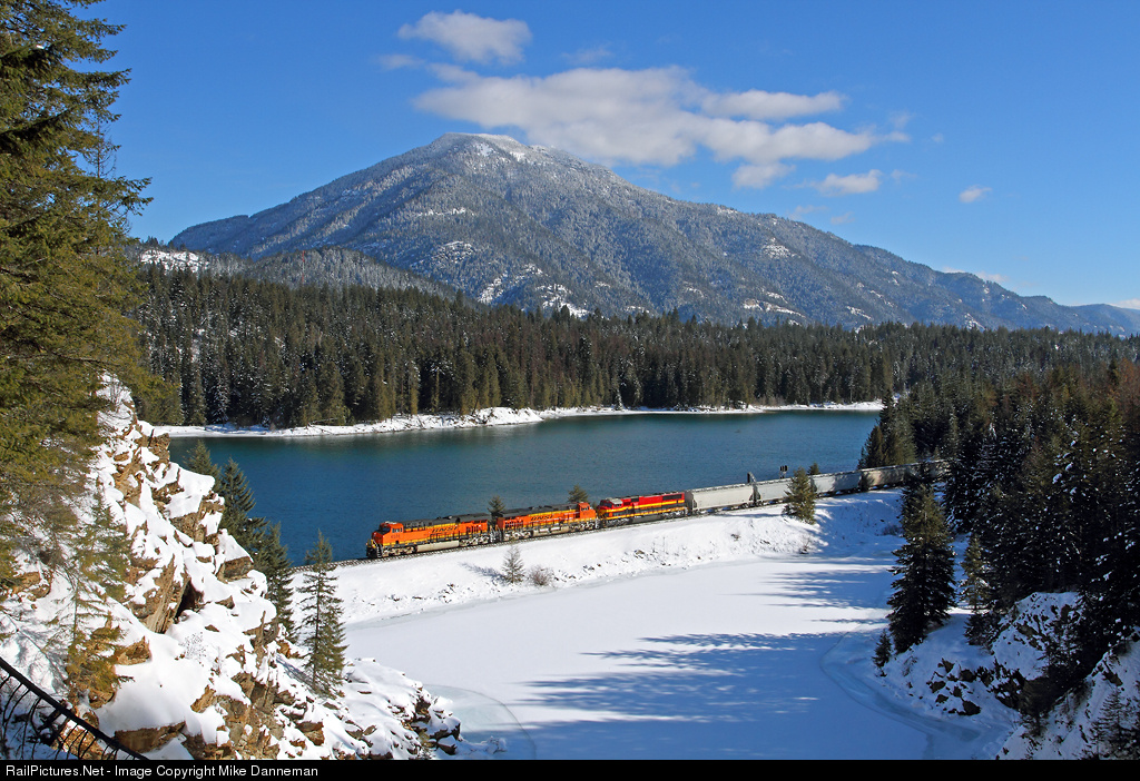 Westbound BNSF train MLAUPAS cruises through a winter wonderland between Noxon and Heron, Montana, on February 8, 2014, over Montana Rail Link’s scenic Fourth Subdivision. KCS SD70MAC No. 3903 adds a little more color to the locomotive consist this bright winter day.