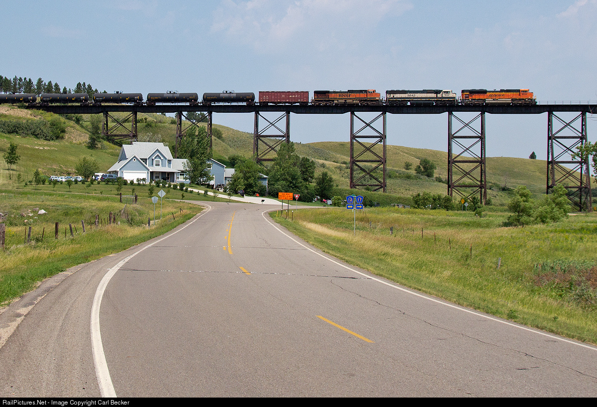 It's a hot Friday afternoon as an eastbound BNSF crude oil train passes across the impressive bridge over the Gassman Coulee, nearing the crew change point at Minot.