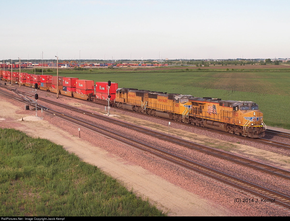It's late in the evening and the sun is not far from setting as a UP stack train working Global 3 pulls forward to make a double. The expansive yard can be seen in the distance along the horizon.