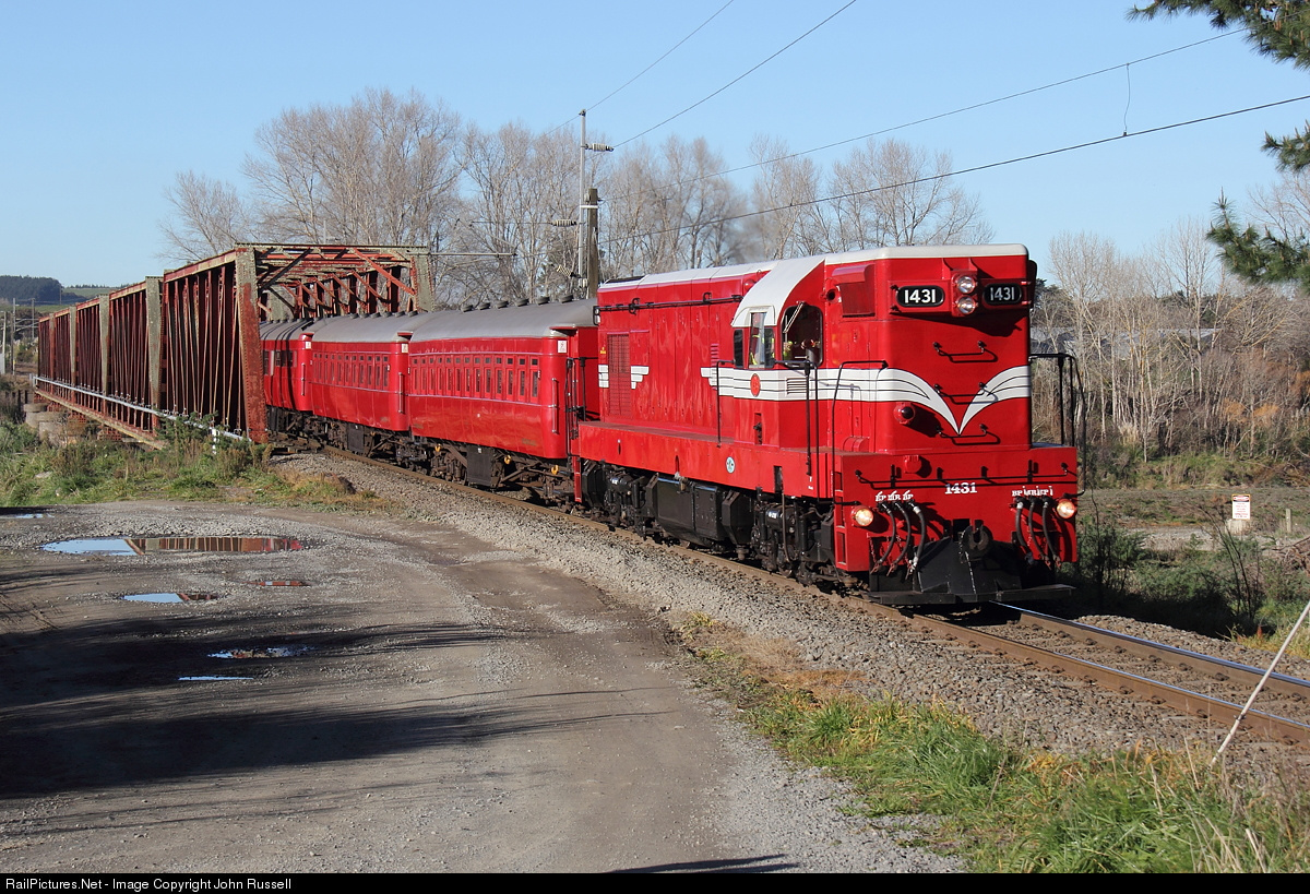 1431 was built by Clyde Engineering in NSW in 1957 for NZ Railways. It was sold to Steam Incorporated in 1988 who restored and returned it to mainline service in 2009. Here it is seen crossing the Rangitikei River near Marton. The train will later cross the same river twice on viaducts 78m and 81m high hauling the excursion bound for the ski town of Ohakune below Ruapehu (2797m.)