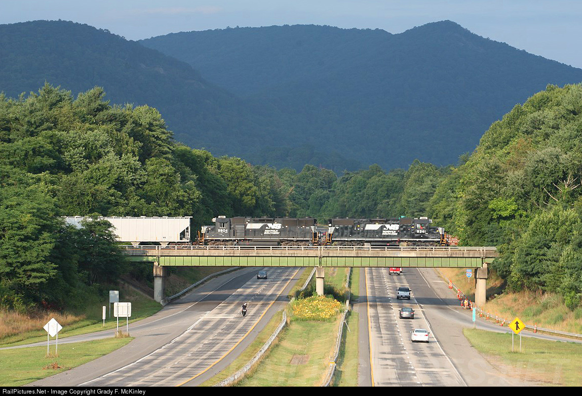 | The sun sets on P44 in more ways than one. In just two weeks Norfolk Southern job P44 will no longer exist once WATCO's Blue Ridge Southern takes over operations of some of the branch lines around Asheville. Here, P44 crosses Interstate 40 on its nightly run down the W-Line. |