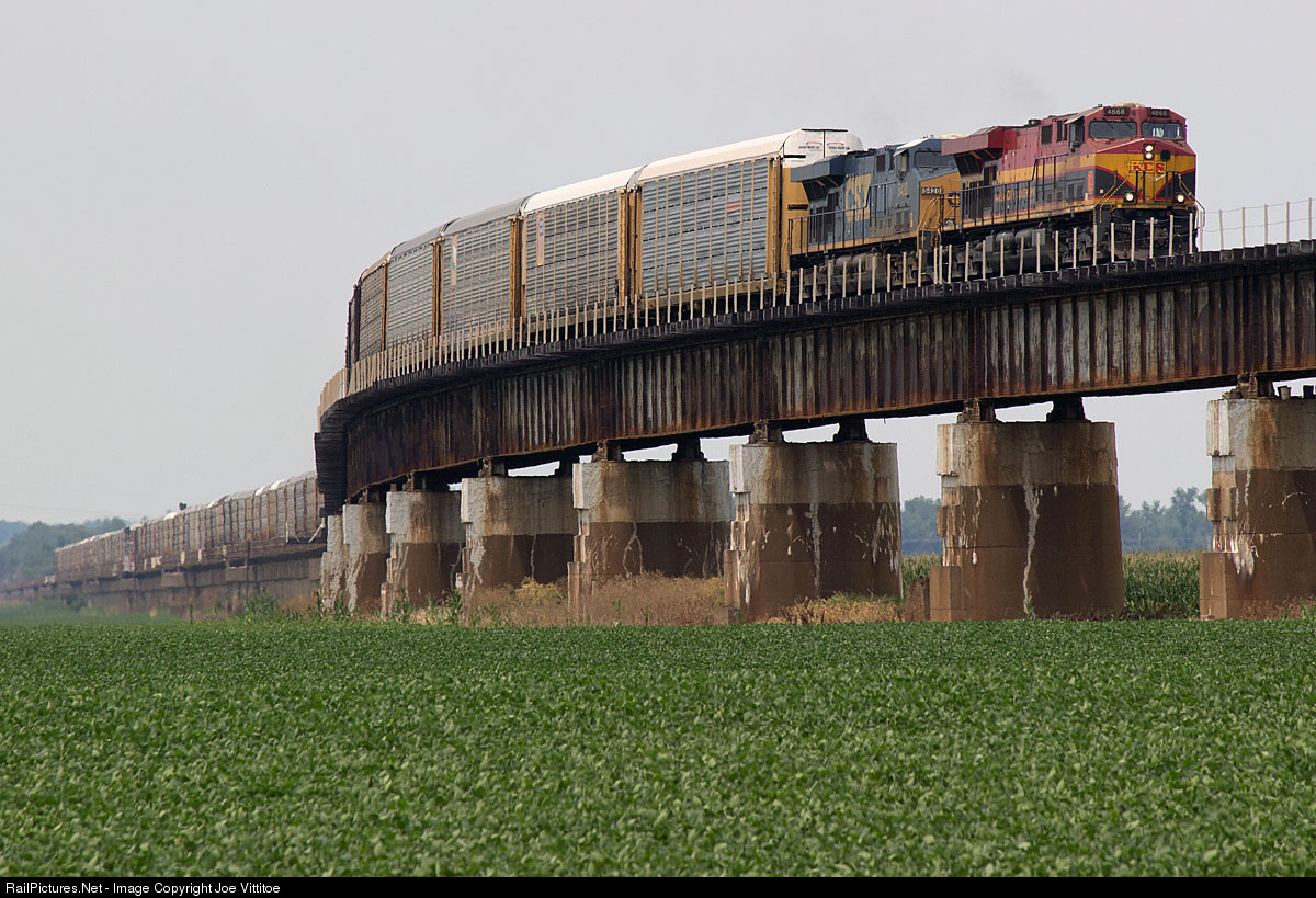A KCS ES44AC leads a southbound CSX rack train as it snakes its way to the Ohio River bridge to cross into Kentucky.