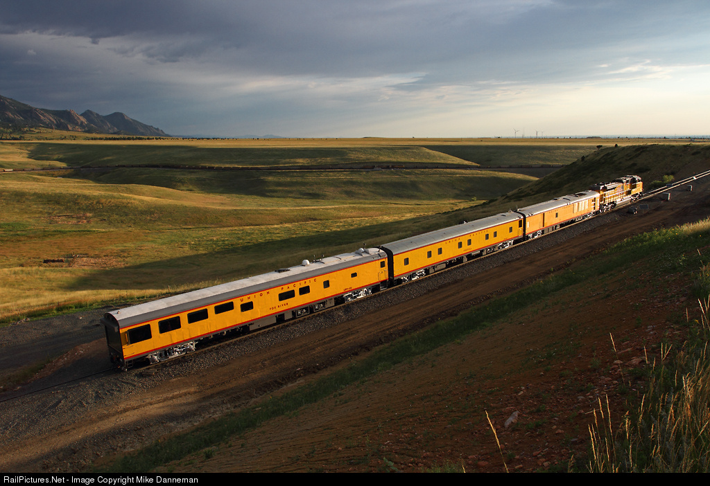 A Union Pacific inspection train approaches Big 10 Curve west of Rocky, Colorado, just after dawn on July 26, 2014. EMD SD70ACe No. 8734 leads power car UPP 207, sleeper “Portola” UPP 1610 and theater car “Fox River” UPP 420.