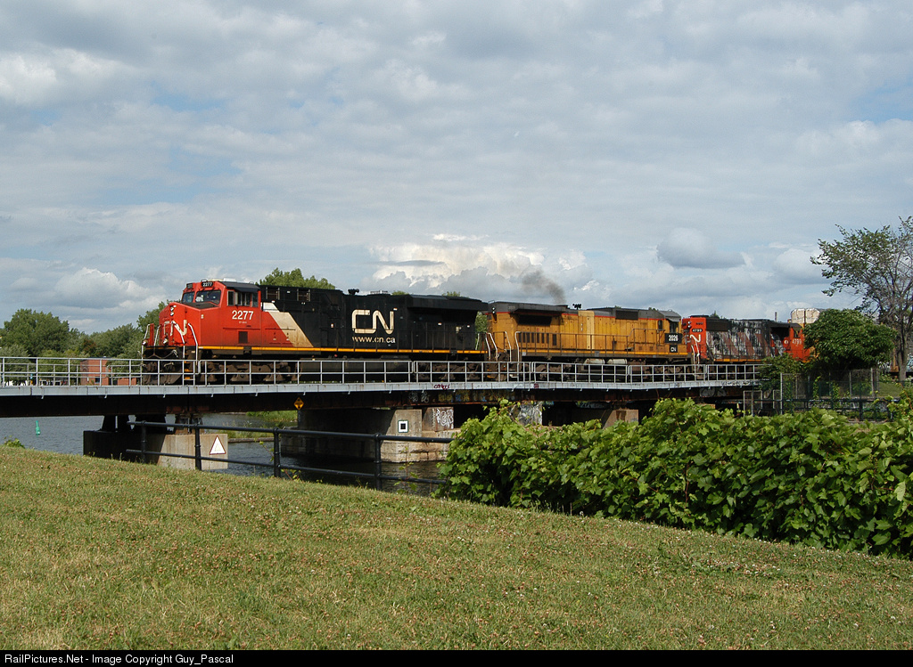 | CN 401 comming out on the bridge,with CN 2026 patched locomotive,former Union Pacific GE C40-8,leading a manifest train to Taschereau yard.
