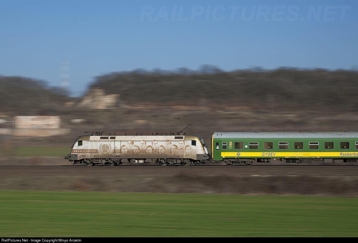 470 010 also known as the "Aranycsapat" (Golden team) celebrates the onetime almost world recorder football team, the hungarian national soccer team. Unfortunately ,today only one player is still alive of the team. This time the engine is running witg IC924 (Alpokalja-Kékfrankos) from Budapest to Sopron, with direct carriages to Szombathely.