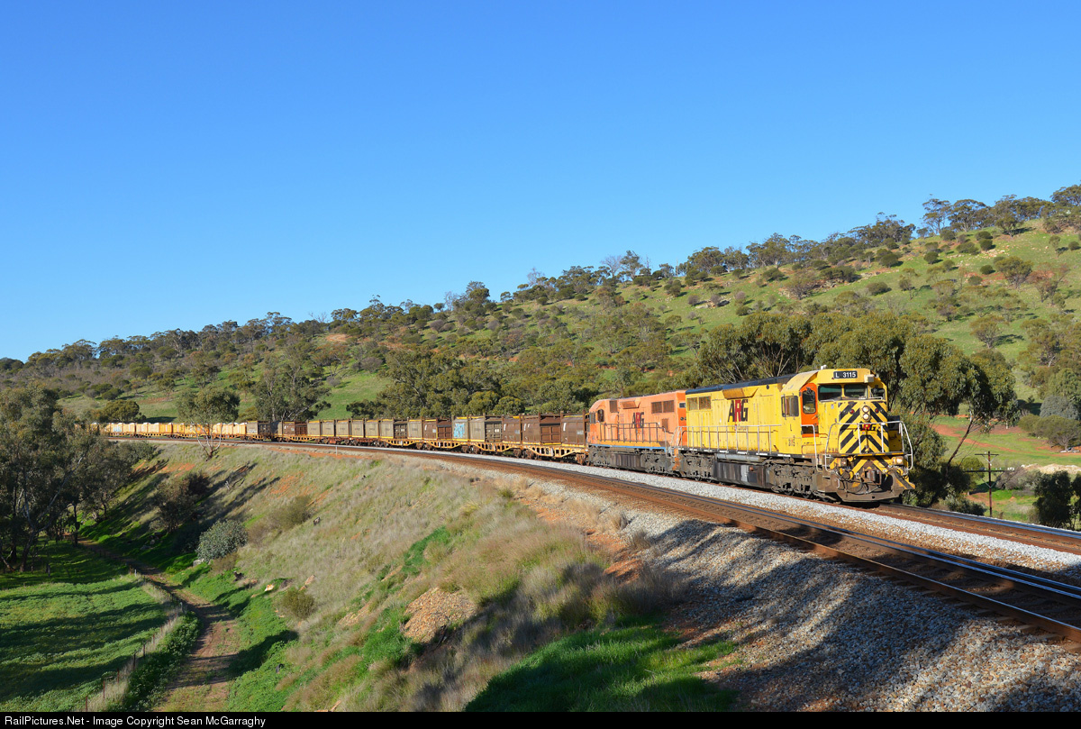 | A pair of original, unmodified L's 3115 & 3118 work a load of salt containers on 5474 from Koolyanobbing as they round the curve at Donkey's Crossing, Toodyay in Western Australia's very scenic Avon Valley. |