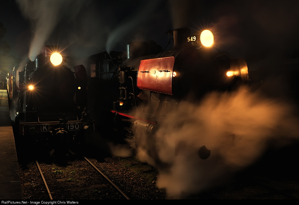 The Victorian Goldfield Railways' J549 and Steamrail's K190 perform for photographers during a 'Rail Scenes' night shoot.