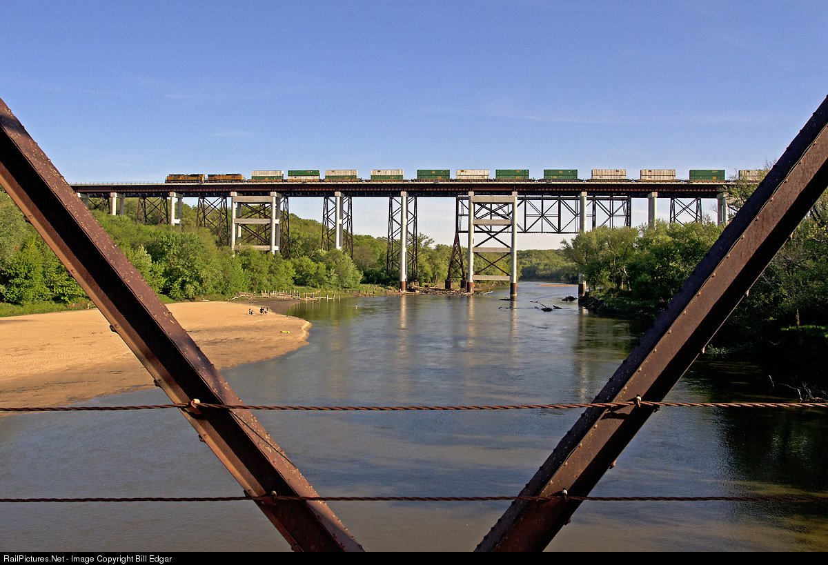 UP 8744 leads an eastbound stack train across the new Kate Shelley bridge over the Des Moines River as beach goers look on. The original structure remains standing just south of the new double track bridge.