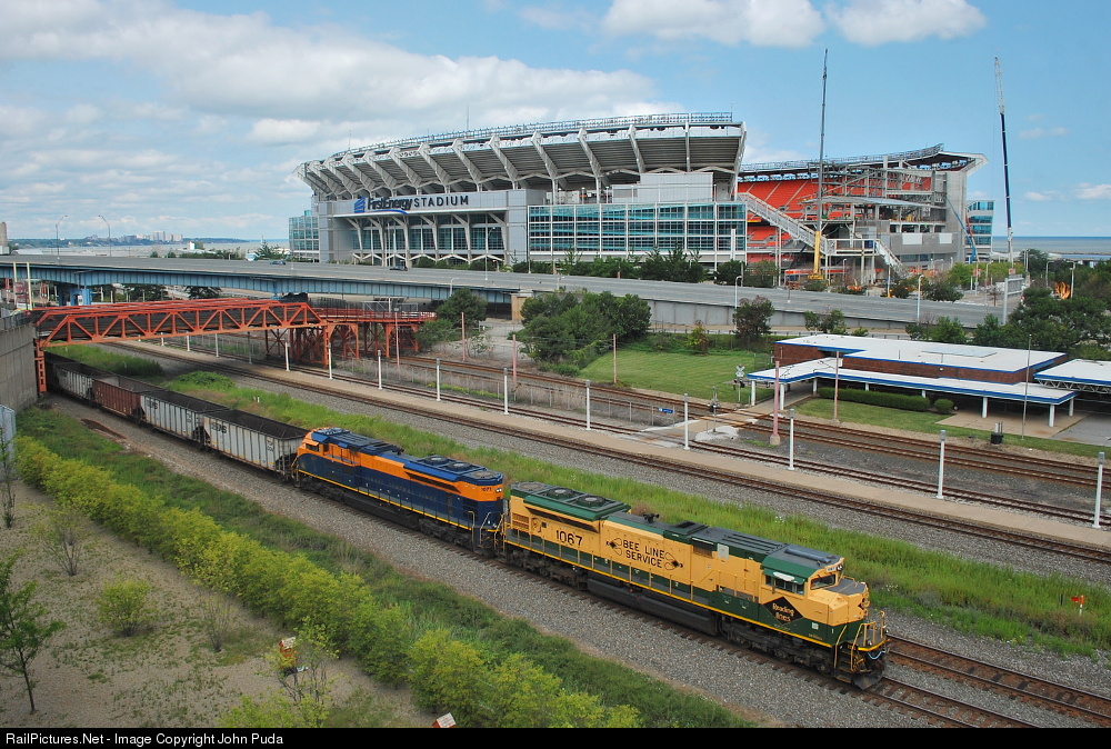 The RDG/CNJ combo lead empty hopper train Q47 east as it passes in front of First Energy Stadium in downtown Cleveland.