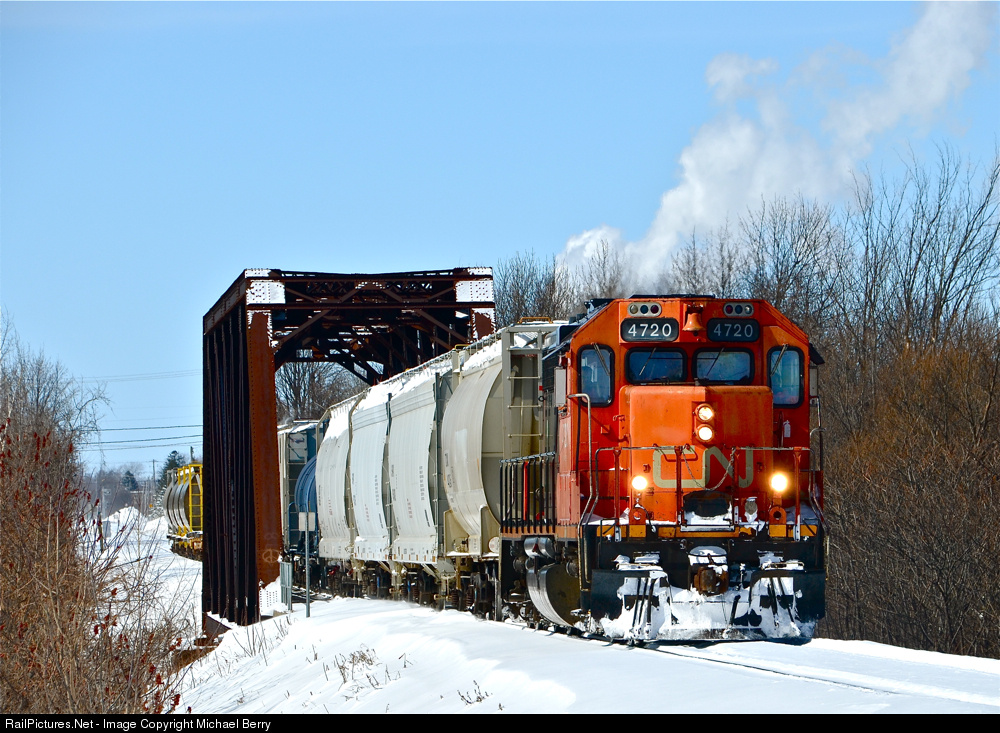 | The day after a snowstorm. CN 538 (the Valleyfield local) is heading towards Cecile Jct with CN 4720 leading on a beautiful day after a substantial snowstorm. Behind it is CN 327, which will pass 10 minutes later. |