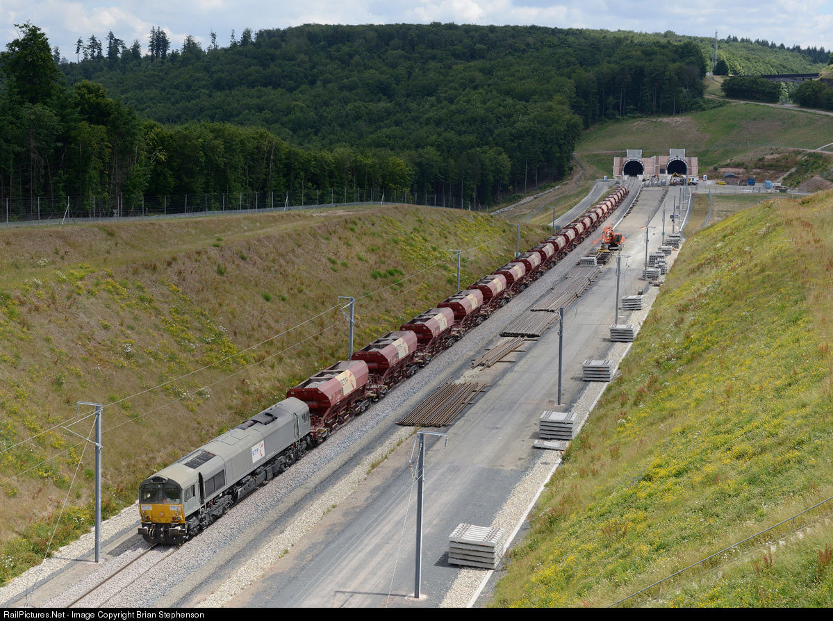 | A new railway that is not on the map! Former DLC class 66 No DE 6304 on hire to French contractor ETF at the rear of a ballast train about to enter the Vosges tunnel on the LGV Est phase 2 line that is under construction in Eastern France. In the righthand background a bridge over the A4 Autoroute can be seen. |