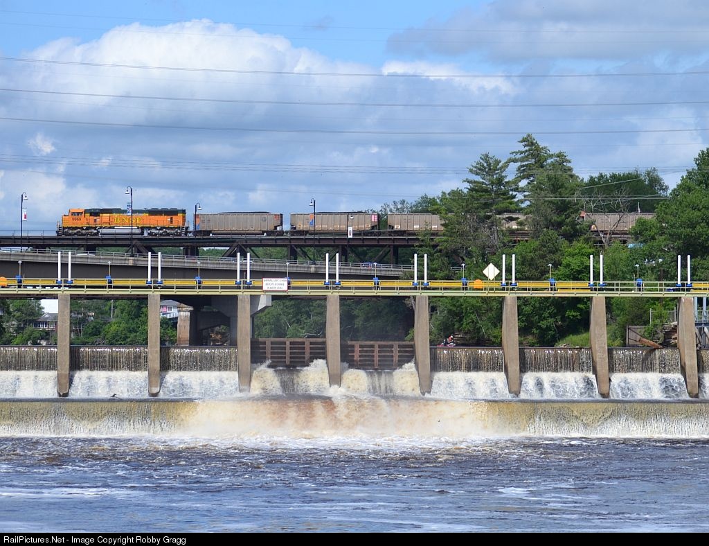 BNSF SD70MAC 9969 pushes as the DPU of a eastbound Columbia coal train, passing over the Wisconsin River and the Kilbourne dam.