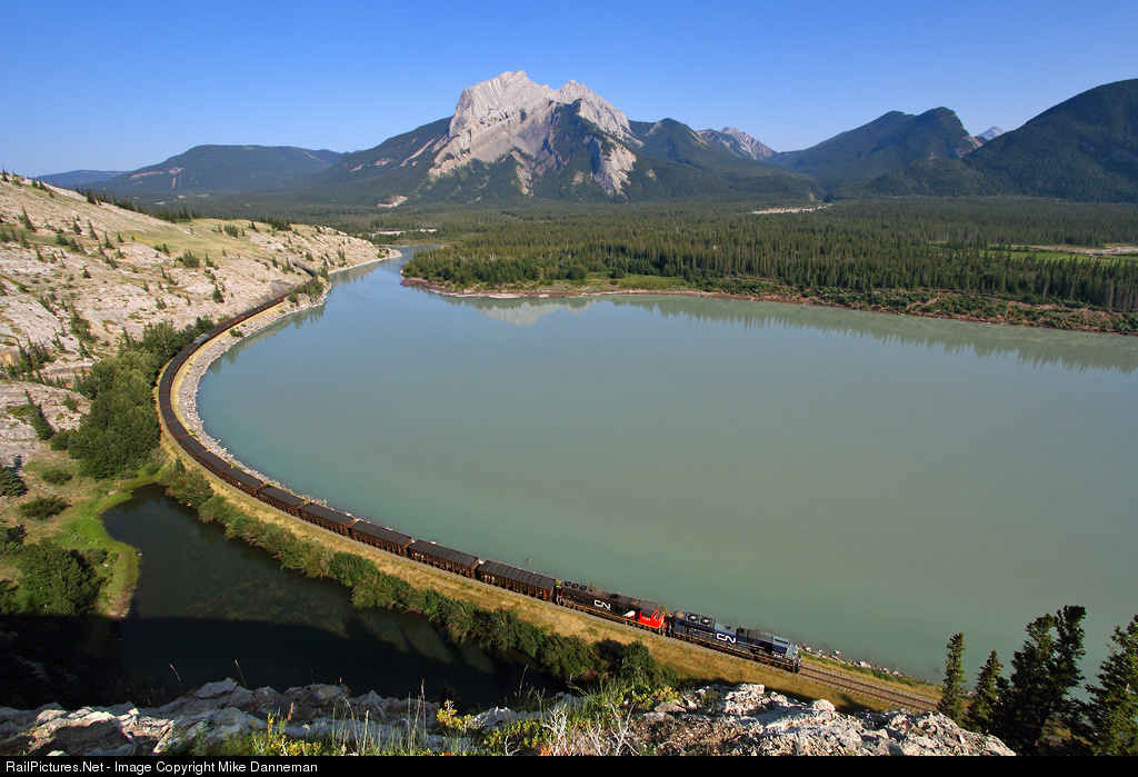 Canadian National train No. 303 exits Brule Tunnel and approaches Park Gate, Alberta, on the afternoon of July 12, 2014. Leading the train is CN EMD SD70ACe No. 8101, still in blue and gray demonstrator paint. Roche à Perdrix and Folding Mountain stand tall in the background at this eastern boundary of Jasper National Park.
