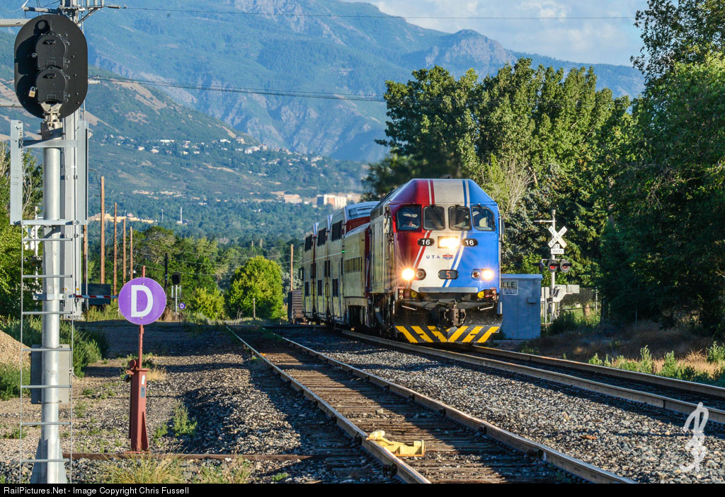 A FrontRunner train on non-UTA tracks with wood ties passes through Harrisville, Utah this evening, north of Ogden. UTA has its own ~80 mile line with concrete ties between Ogden and Provo, but four round trips to Pleasant View Station utilizing Union Pacific rails are done at the start of service and in the evening, so summertime is about the only time of year you can get a sun-lit pic of FrontRunner on this line.