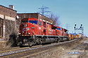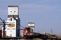 An eastbound Canadian Pacific stack train rolls past what's left of elevator row at Gull Lake, Saskatchewan. Just out of the frame to the left is a Pioneer elevator, and the train is passing elevators from Saskatchewan Wheat Pool and United Grain Growers. The "B" indicates that there was at least one more Pool elevator here at one time. In the distance is a high through-put (HTP) elevator; the HTP's killed off the wooden elevators. Time has not been kind to even this remnant of Gull Lake's elevator row, as the Pool elevator is now gone.