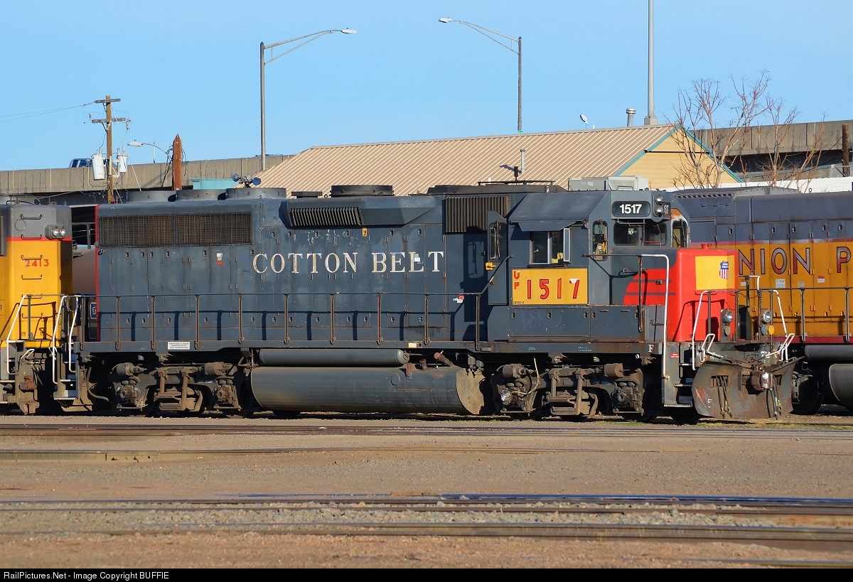 | UP 1517, a former St. Louis Southwestern GP40M-2, still had her Cotton Belt 'bloody nose' markings on at the time of this photo. In early 2013 she was repainted in the standard UP armour yellow. Too bad they could not have repainted as a heritage unit and retained the Cotton Belt scheme. |