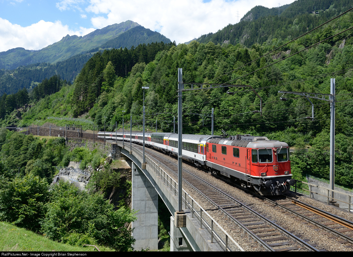 | An SBB Re 4/4 II crosses the Intschi Reuss Bridge as it comes down the Gotthard north ramp with the 10.47 Locarno to Zurich HB IR train. This bridge is sometimes refered to to-day as the Intschi Tobel Bridge (Intschi Valley) and it is 76.5 metres above the Reuss river below. It is unusual in having a footpath underneath between to two great concrete beams that carry the tracks. |