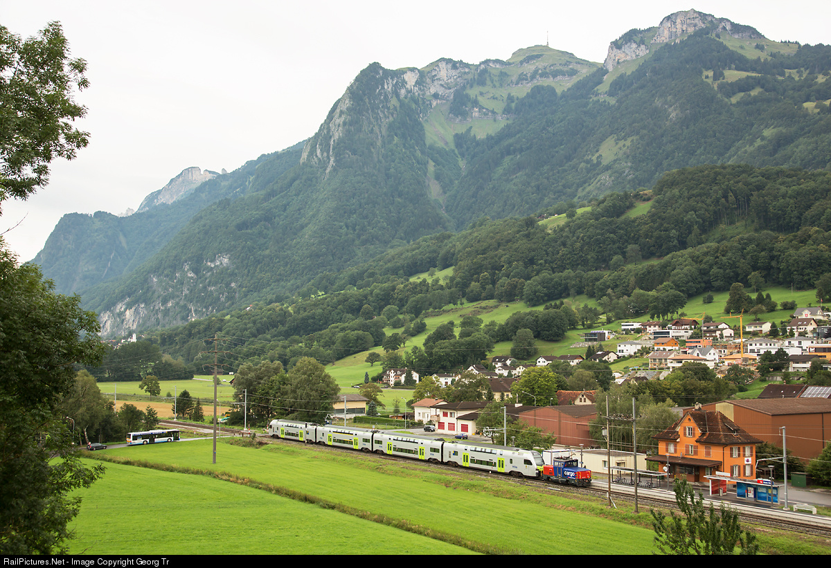 | Eem 923 022 of the SBB is pulling a doubledeck commuter train RABe 515 004 "MUTZ 004" of the BLS from Buchs (SG) to Oberriet and is pictured in Rüthi SG with Hoher Kasten in the background. The RABe 515 will undergo the warranty works by Stadler Rail in a rented factory hall in Oberriet. |