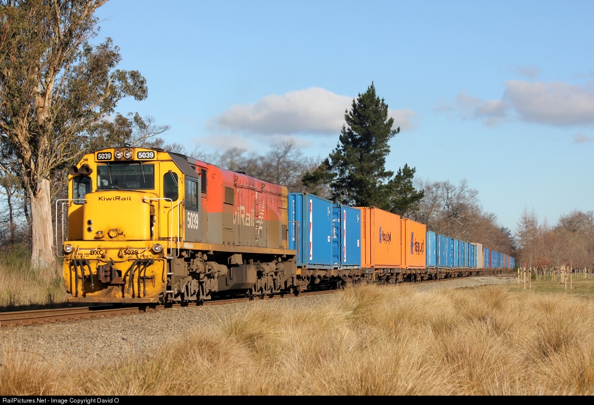 DXC 5039 heading north to Christchurch with the first colour scheme that KiwiRail tried. The train consists of export boxes of milk powder.