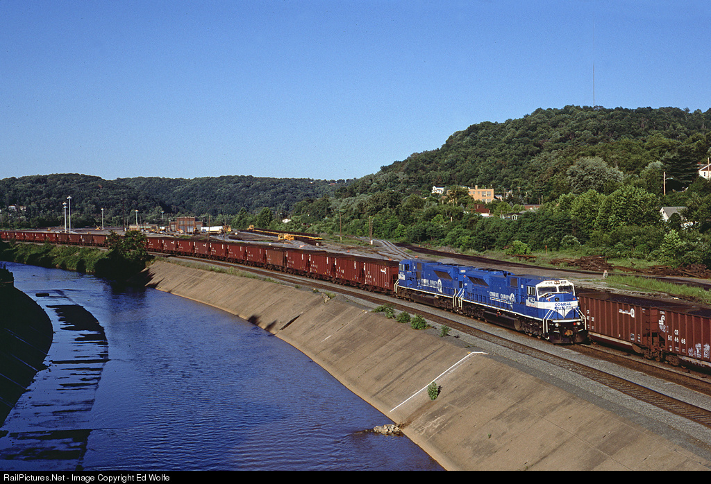A westbound empty hopper train with a pair of 80 MAC's in the lead roll by loaded coal train UBT-23B on Track 99. Prior to the development of Pitcairn Yard into an intermodal facility, several loaded coal trains made a daily appearance through Pitcairn on their eastward journeys.