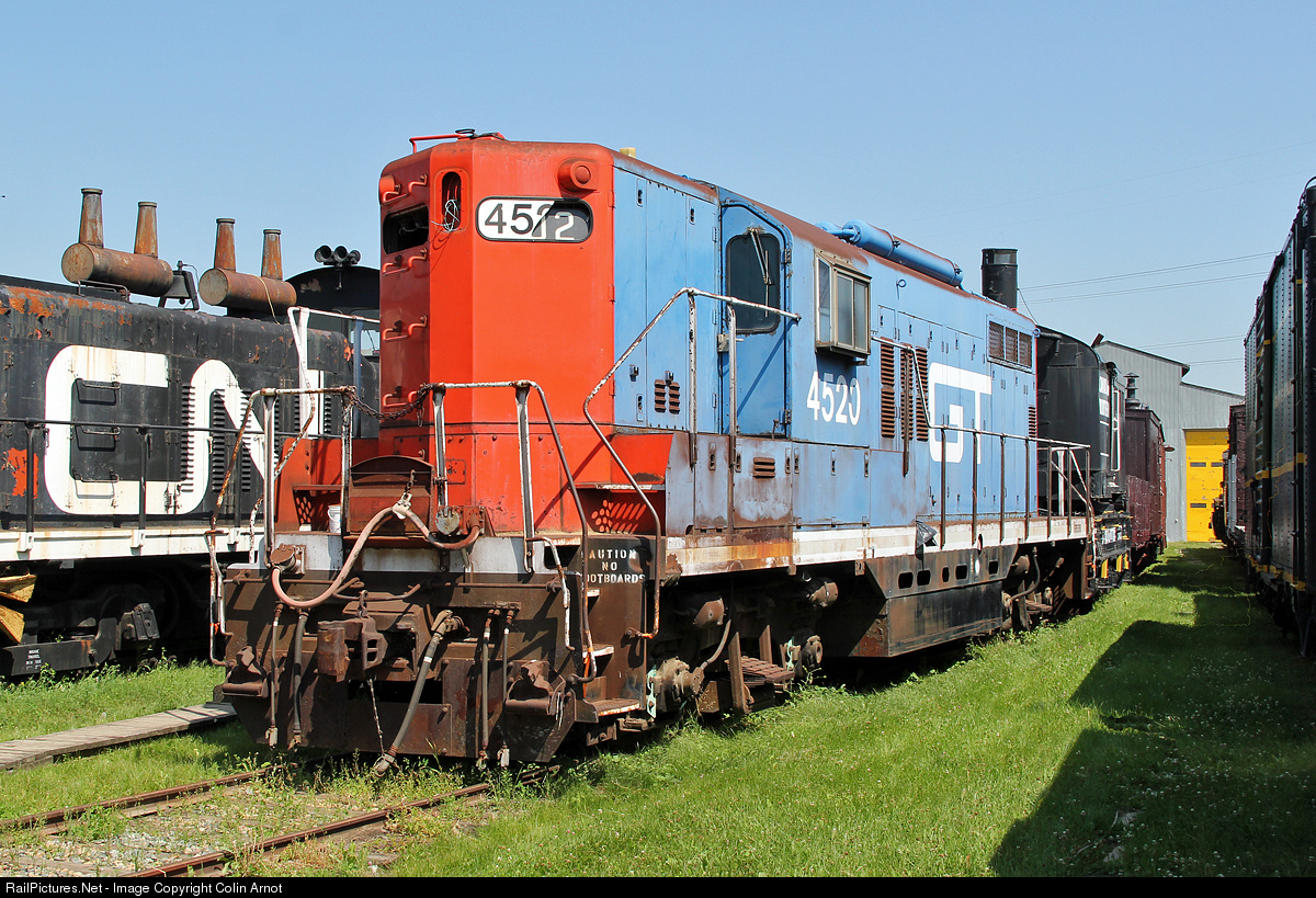 | GT 4520 was the last CN GP-9 left with the high short hood. It has roof mounted air reservoirs which on passenger Geeps had to be relocated because a water tank was added under the frame for a steam generator.