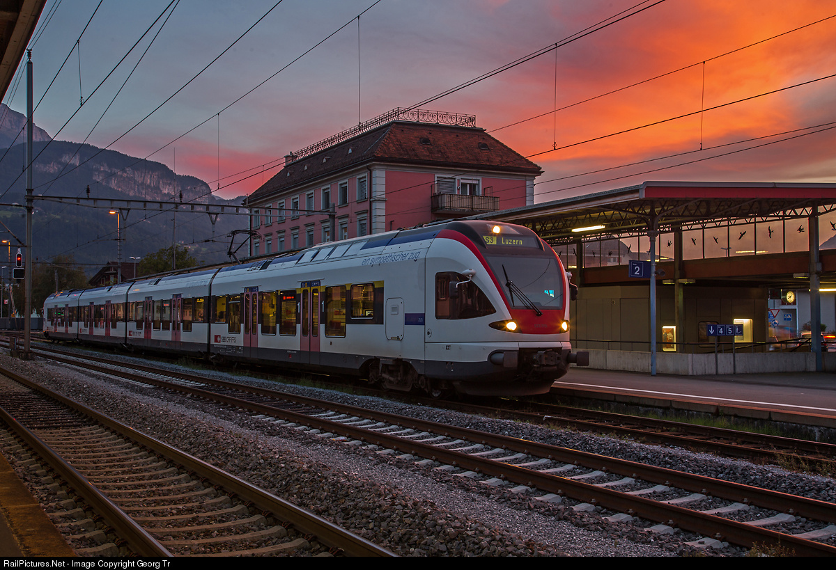 | On Swiss National Day, 1st of august, the "Flirt" trainset RABe 523 010 is ready for departure as S3 from Brunnen to Lucerne. |