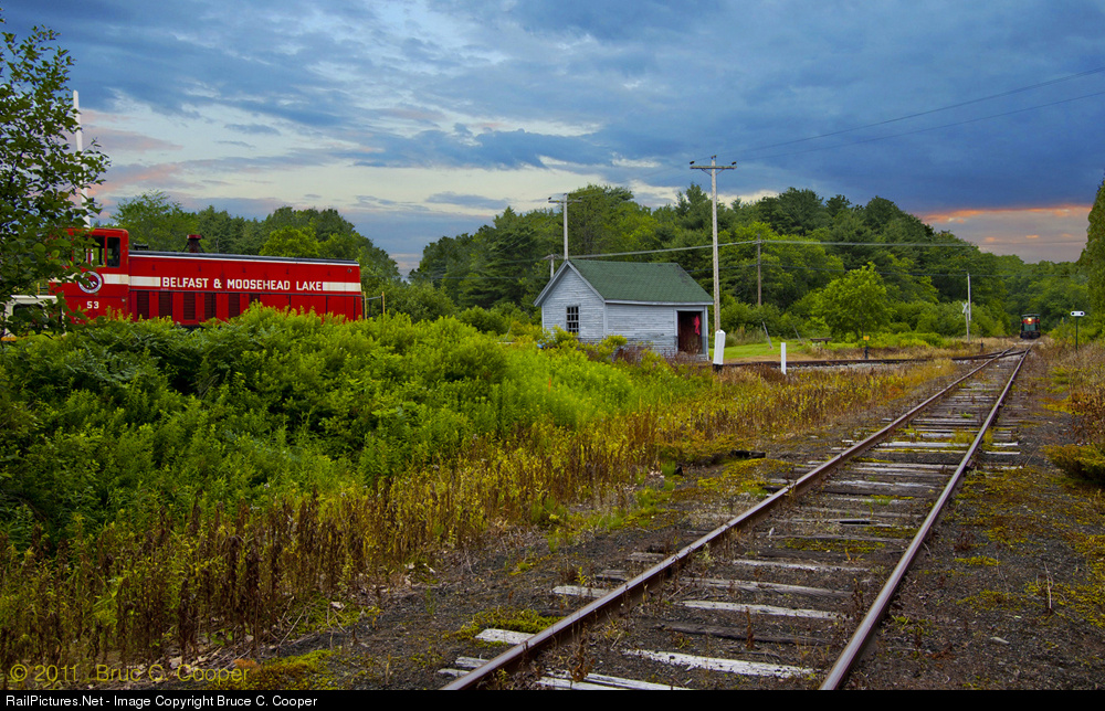 BML#53, a late 1940's GE 70-Ton diesel electric locomotive acquired used in 1970 from the Montpelier & Barre Railroad in Vermont, seen at dusk sitting on the City Point Central Railroad Museum siding at MP 2.5 of the B&MLRR's 33-mile grade from Belfast to Burnham Junction. BML#50, the road's first non steam locomotive which the line bought new in November, 1946, is seen approaching from the west still going strong after 68 years of service to the B&MLRR.