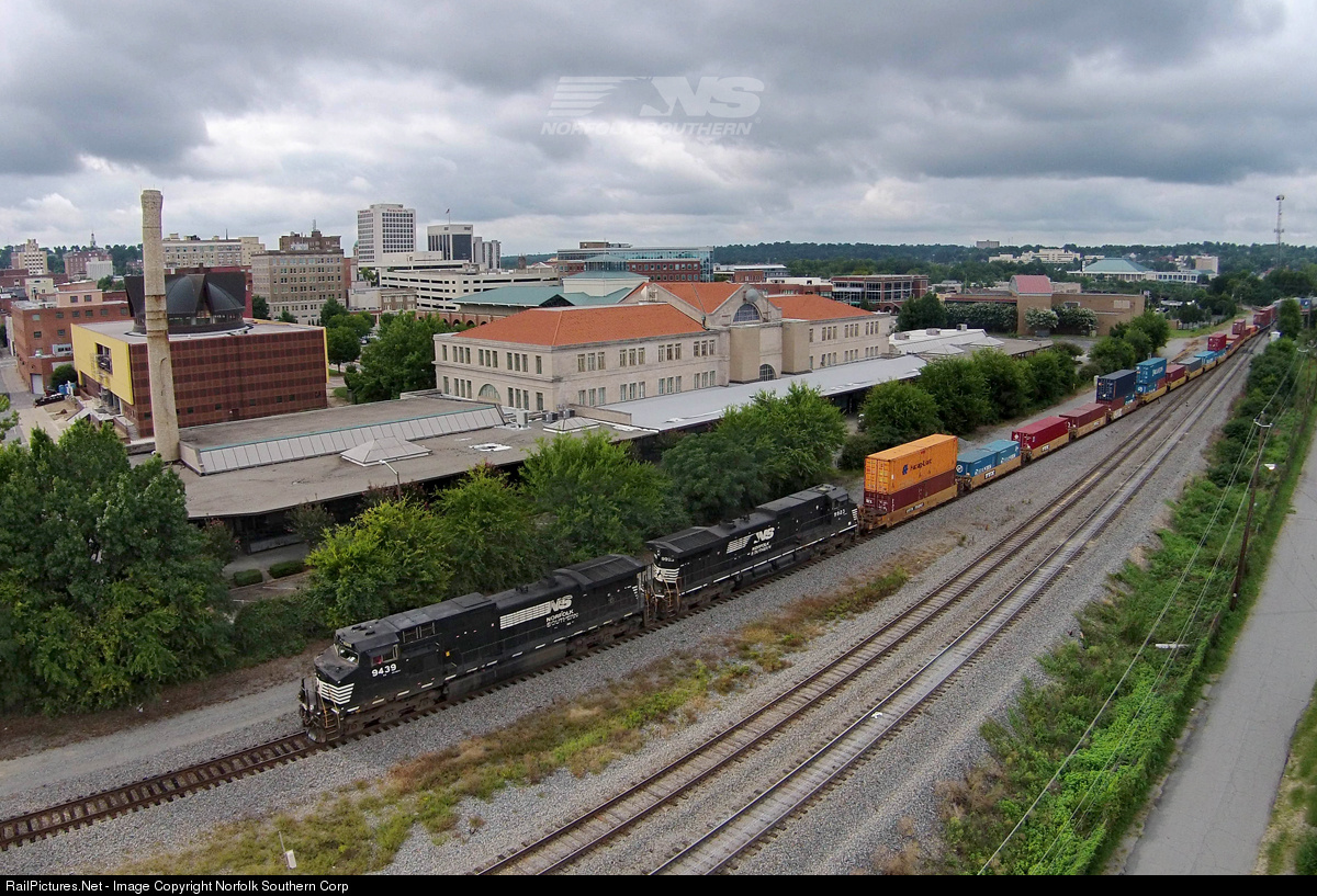Norfolk Southern intermodal train 207 operates daily between Garden City, GA (Savannah) and Austell, GA (Atlanta). The train passes through downtown Macon twice along its journey: once southbound as it arrives from Savannah, and again northbound after running the "Loop" to turn the train and swapping crews. Here the train is seen negotiating Macon Junction as it arrives from Savannah, passing the historic Macon Terminal Station. The station was built in 1916, and once hosted offices for eight different railroads. In the mid 20's, it served as many as 100 train movements per day. These days, it houses offices for local businesses and only sees Norfolk Southern trains as they pass nearby on their way to or from Savannah, Atlanta, or Florida. Photo by Casey Thomason. For more information about Norfolk Southern, visit www.nscorp.com