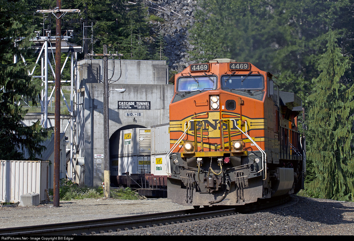 BNSF 4469 crests Stevens Pass and exits the Cascade Tunnel with a South Seattle-Chicago Q train. The "new" Cascade Tunnel opened in 1929 has been in service for 85 years, and was electrified until 1956.
