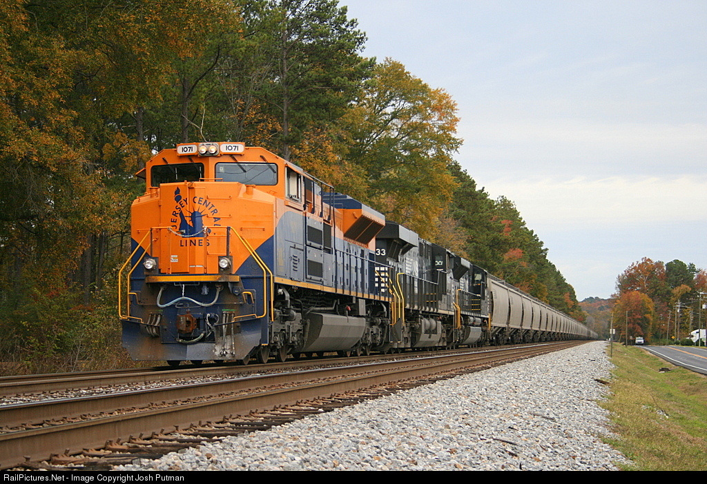 Jersey Central heritage unit 1071 leads a unit grain train at Irondale, Alabama.