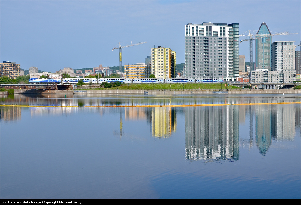 AMT 809, with AMT 1361 pushing is passing the Peel Basin with Montreal's skyline in the background.