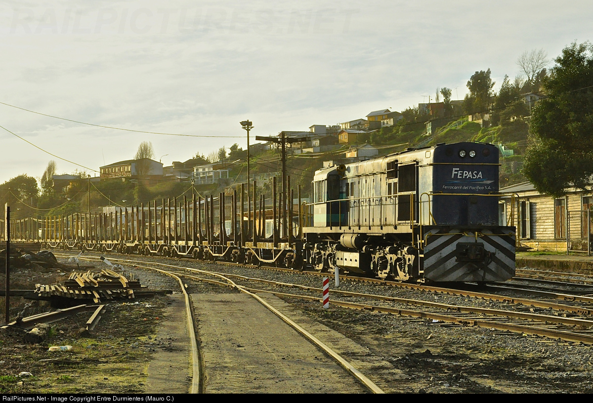 | Ending the day in the coastal town of Coronel, at sunset this train of FEPASA #50.093 from Nueva Aldea with empty wagons for timber transport, continues its journey to Arauco after relieving crew. |