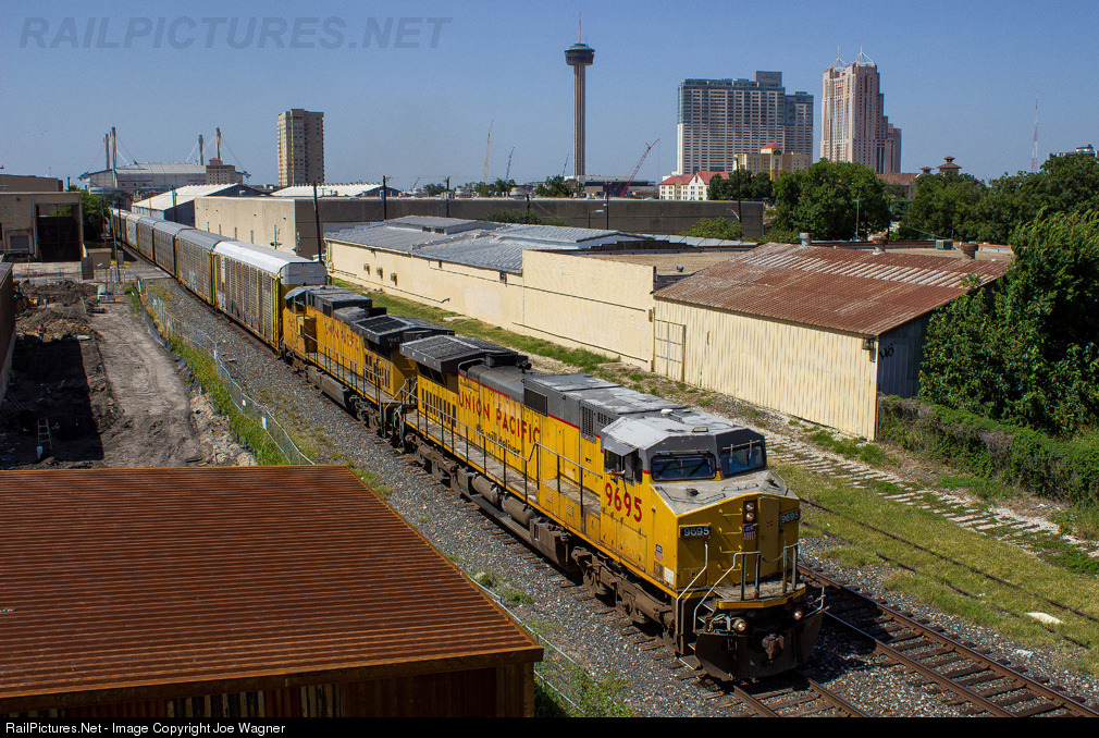 | A pair of ex-C&NW Dash 9's lead a northbound transfer move for Union Pacific's East Yard as they head up the Del Rio Subdivision with part of San Antonio's beautiful skyline looming in the background. The Alamodome, Tower of the Americas, and several tall hotel buildings can all be seen in this photo, which was shot from the Hayes St pedestrian bridge. The engineer had a cowboy hat on! |