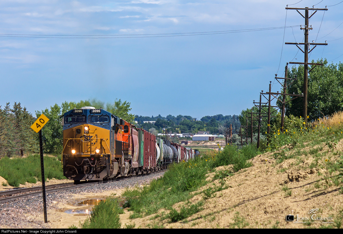 | An CSX GE ES44AH no. 3096 leads a BNSF C44-9W on a short Laurel, MT to Denver, CO manifest up the 1.6% grade on Berthoud Hill. |