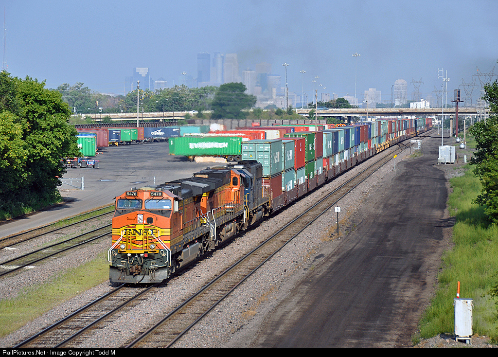 | A lengthy stack train creeps along the BNSF Midway Sub at the equivalent to walking speed on a hot, humid, hazy Saturday morning. The Minneapolis skyline is barely visible in background due to the haze from Canadian wildfires. |