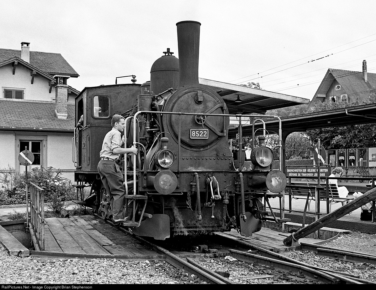 | Former SBB E 3/3 'Tigerli' (small tiger) No 8522 is about to run round its train at Sursee via this small turntable before return to Triengen. This engine (and No 8521) was fitted with a pantograph and form of emersion heater to make steam in 1942/3 to save approximately 300 tons of coal per year. |